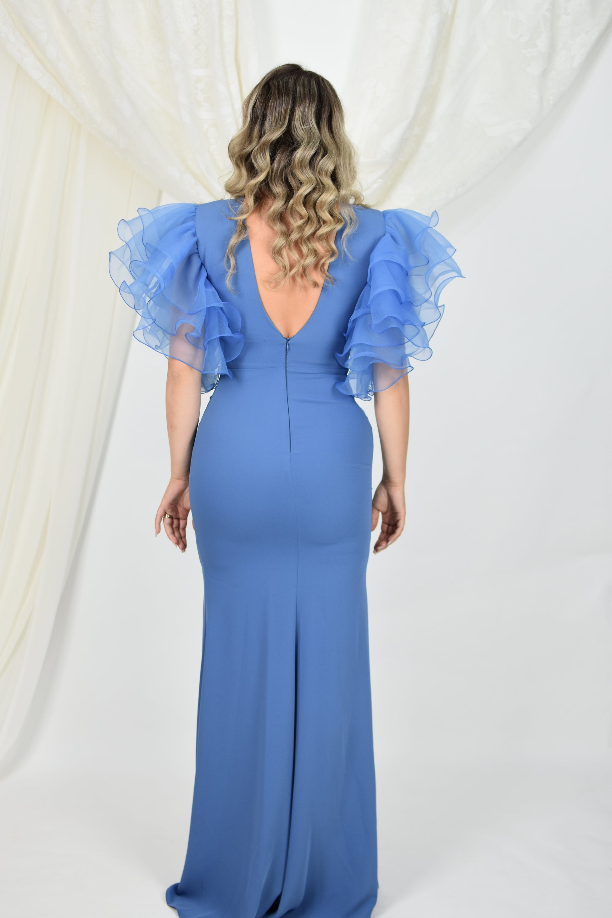 Rochie albastră cu decolteu în V și mâneci cu volanasi, crepătură și închidere cu fermoar la spate. Lungimea produsului poate varia între 165 și 170 cm. Tip material: material satinat